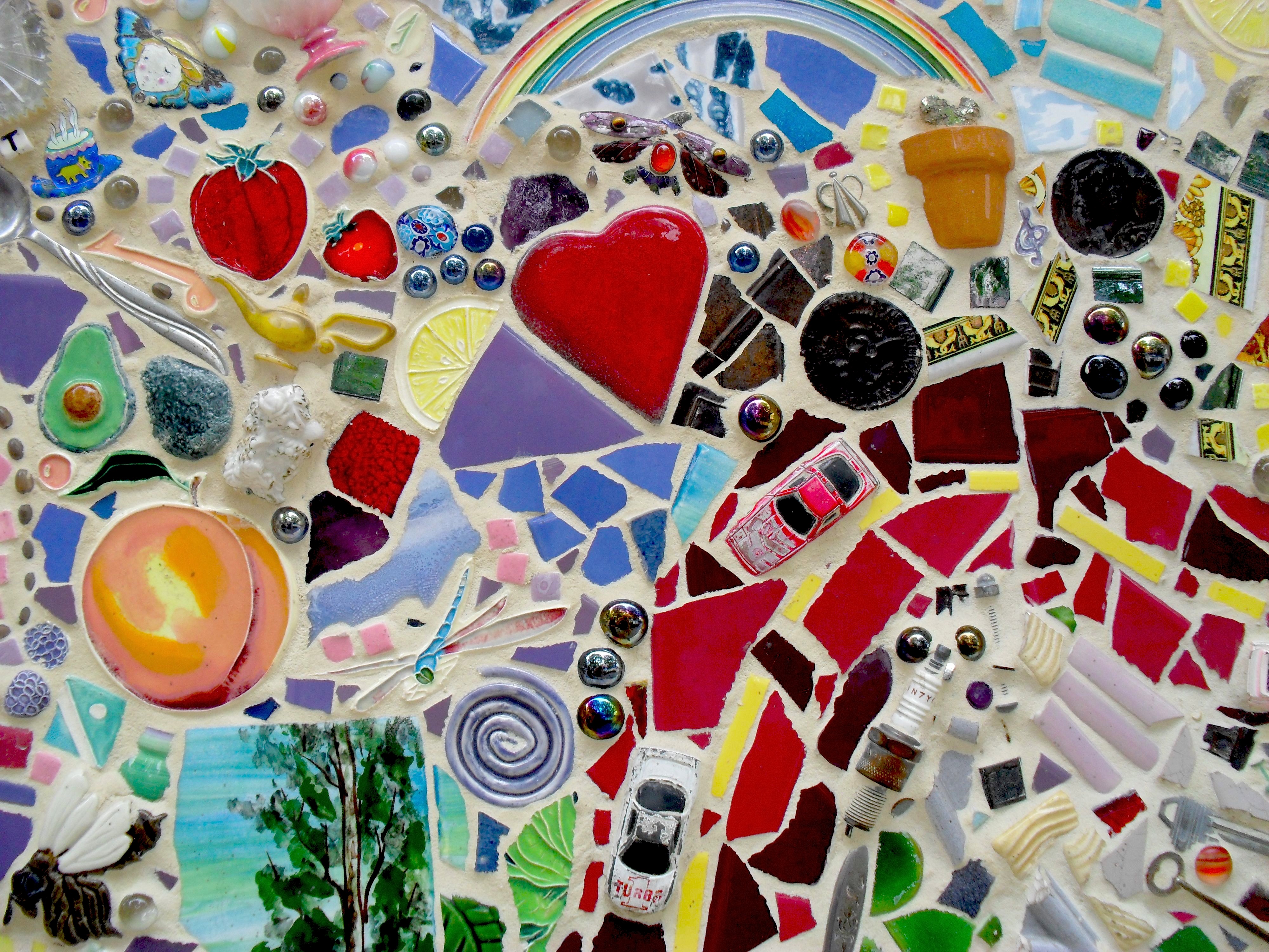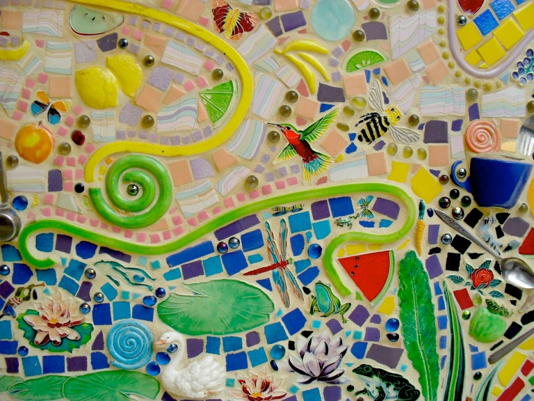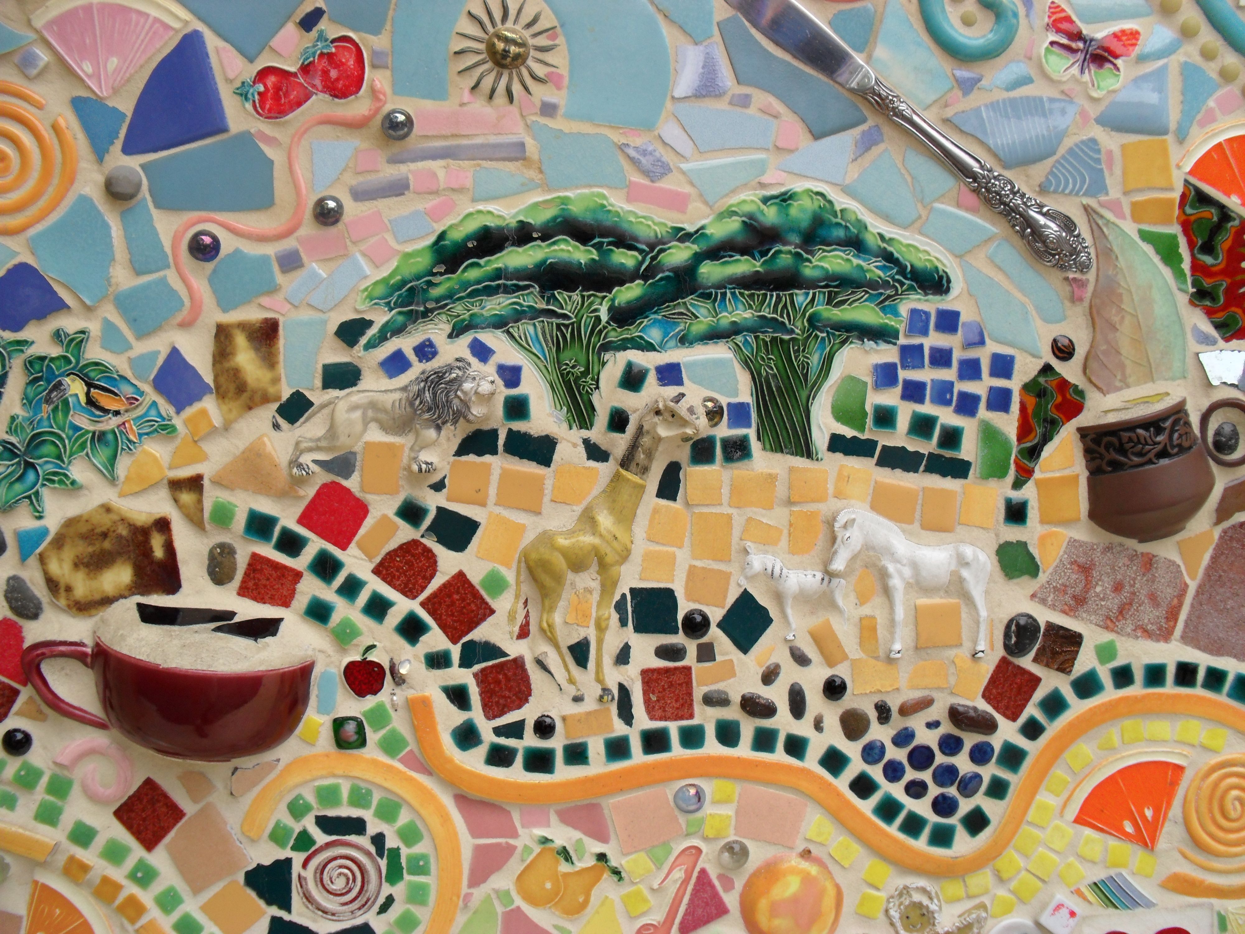 Actually it’s unfair to refer to these fun mosaics as “kitsch”, which is usually a derogatory term. These images are excerpts from a large wall on the side of a building in Disney’s California Adventure theme park. I’m going to try and contact the Disney folks to determine the name of the artist(s). Note the use of silverware, spark plug, toy cars, etc.