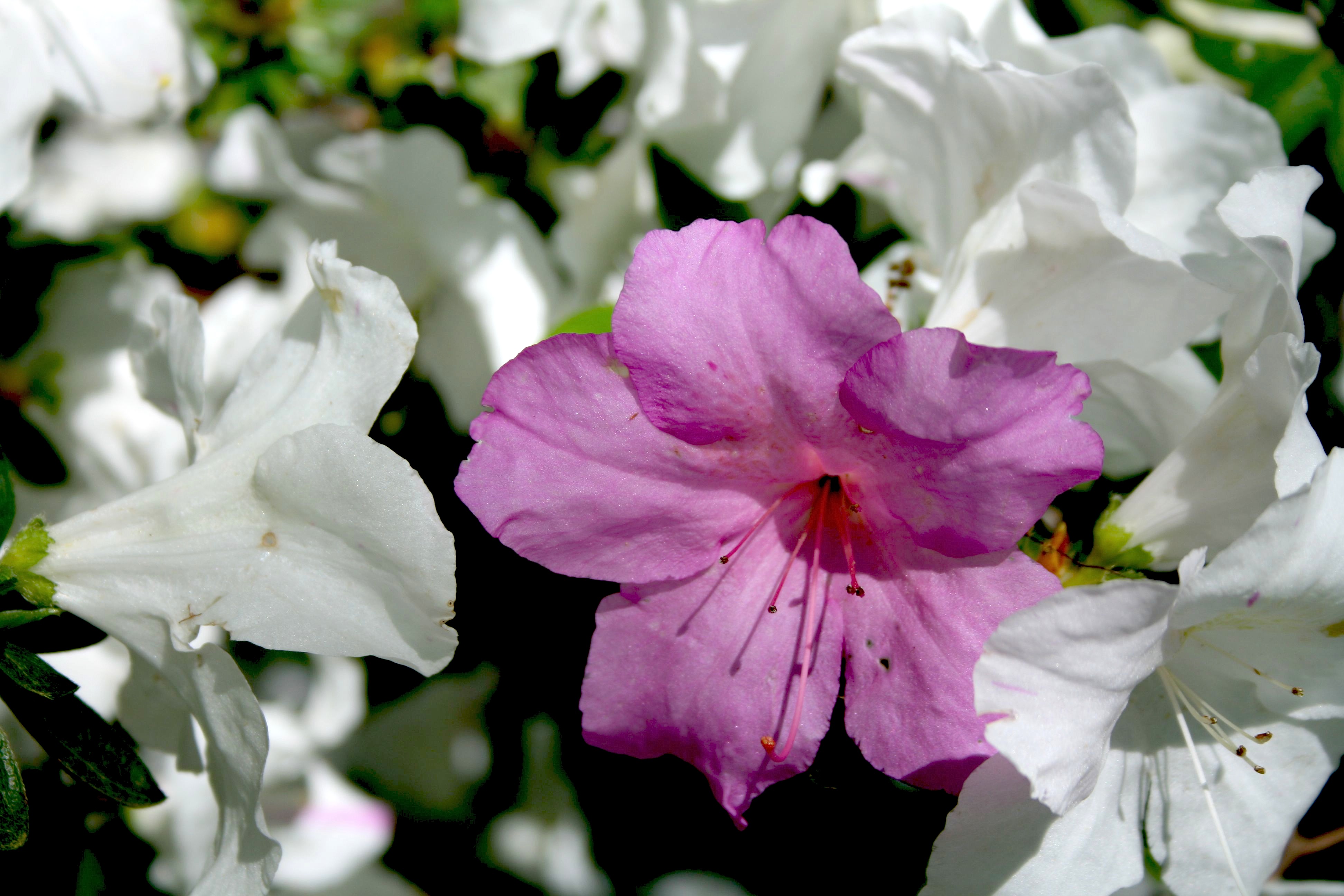 There’s one in every crowd… gotta be different. This is a large-bloomed white azalea (sorry – cultivar unidentified at the moment) that features a faint magenta tinge on each bloom, except of course for the irrepressible “sport” that shouts out for attention. On a plant approximately six feet wide by 4 feet tall, there were only about a half-dozen of these “sports”.