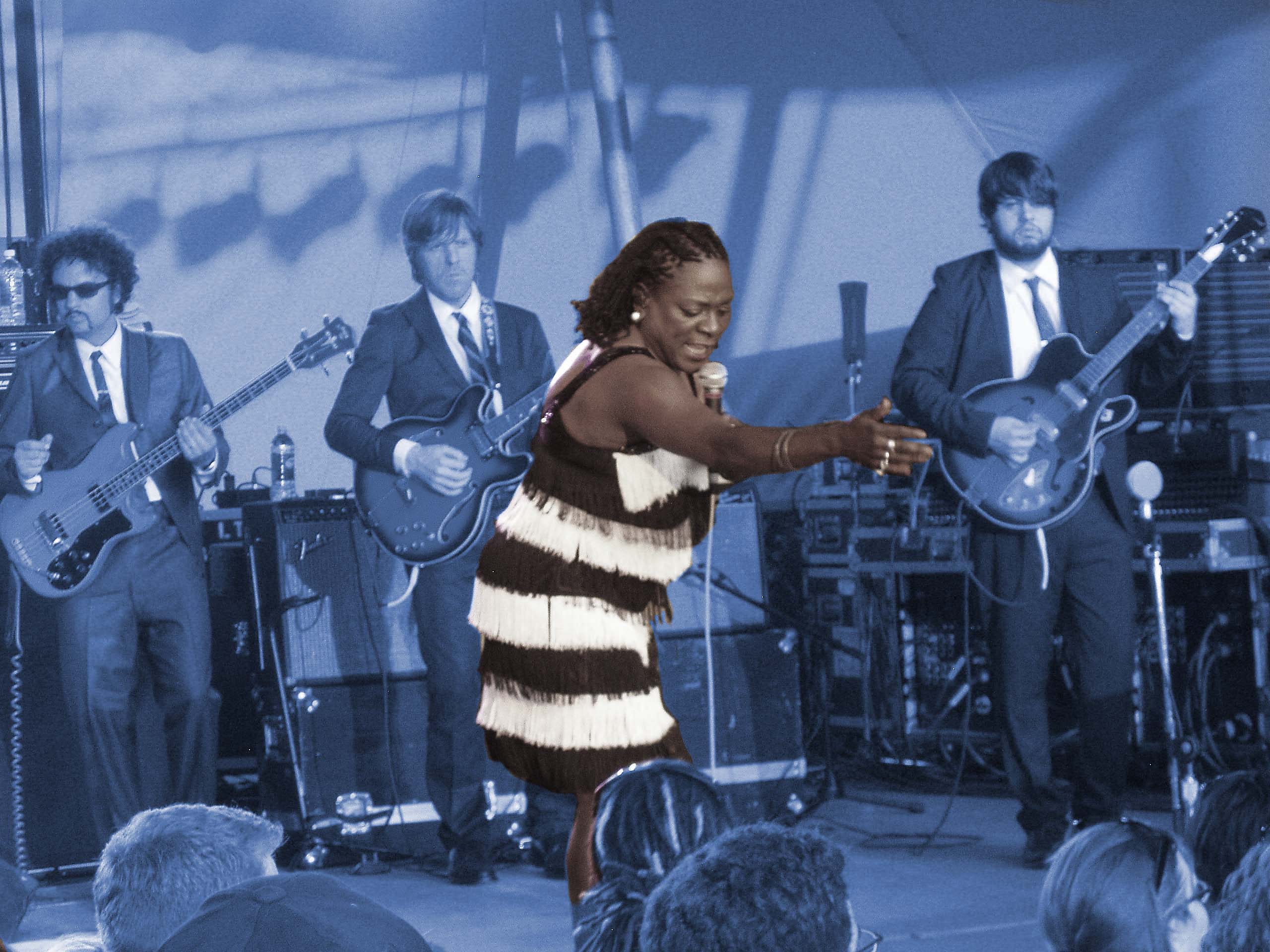Professional photographer Arthur Stephens captured this live action shot and gave it a little colorization to accentuate the contrast between the energy exuded by Sharon Jones and the workman-like composure of the Dap Kings string section.