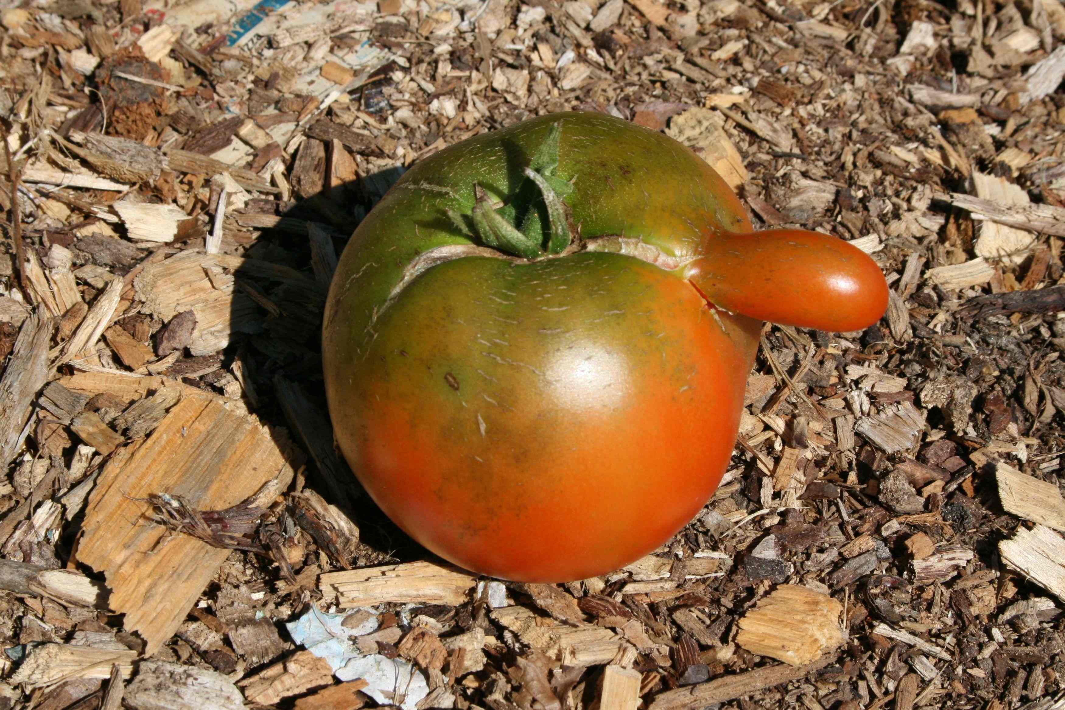 Another possibility is that the growth is simply a genetic throwback to heirloom tomatoes, when non-hybridized tomatoes weren’t perfectly shaped. Our judgement is that the growth does not affect taste or nutrition.