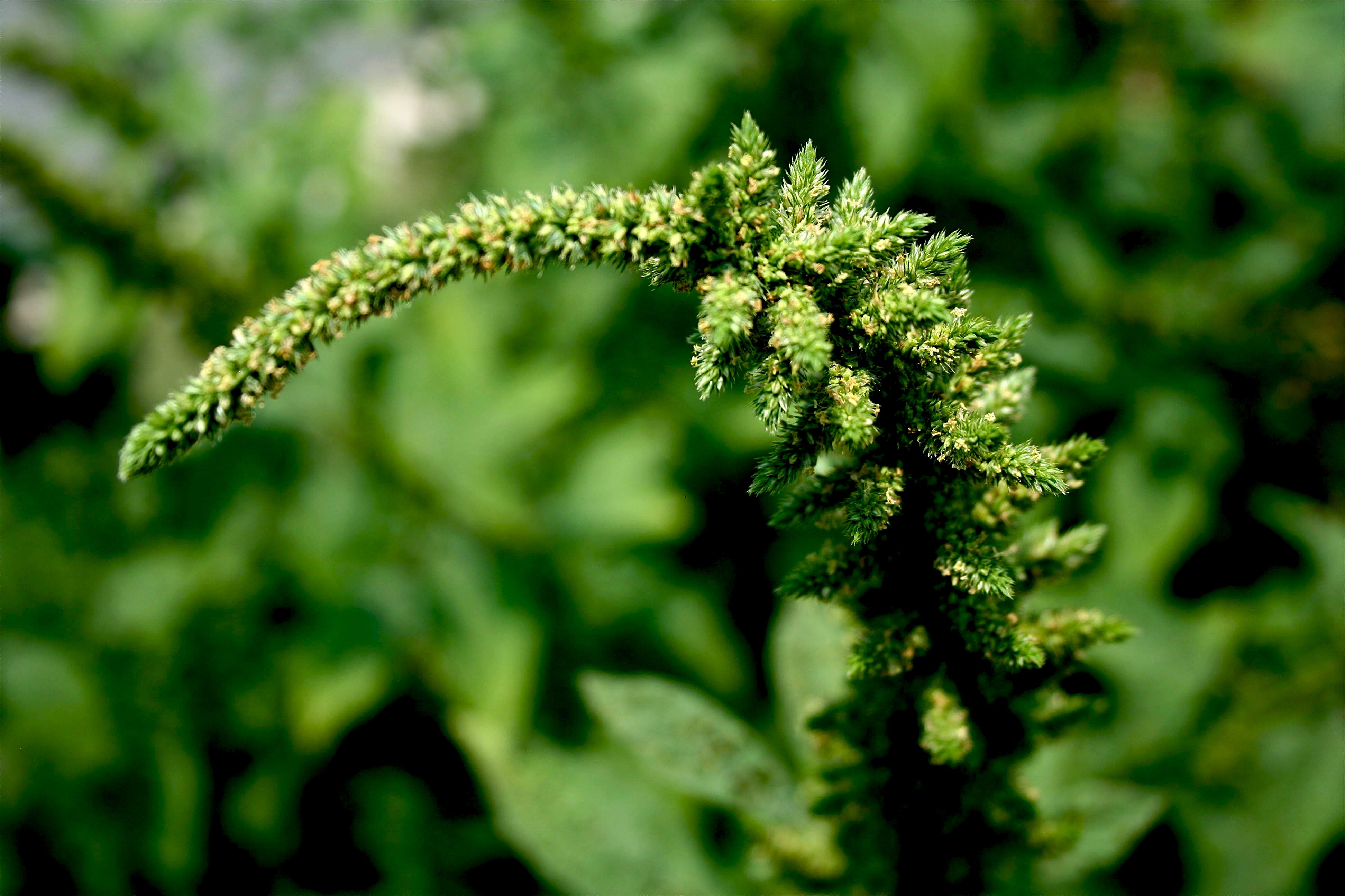 Amaranth is a grain plant and/or leafy vegetable native to the Americas, and favored by the Aztecs. High in fiber and low in saturated fats, the grain can contain as much as 17% protein.* There are quite a few amaranth volunteers in the mix of “weeds” popping up within the Lewis Ginter (LG) Community Kitchen Garden. I have no idea of the origins of the seed in this case.