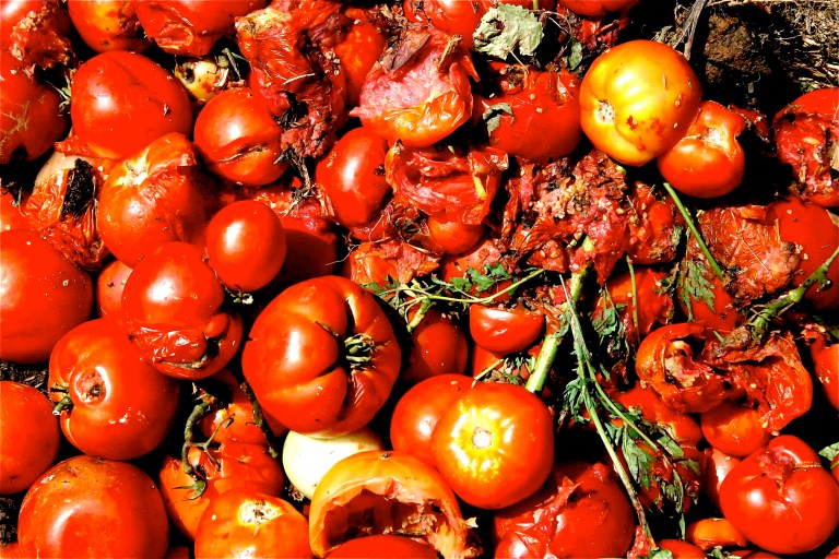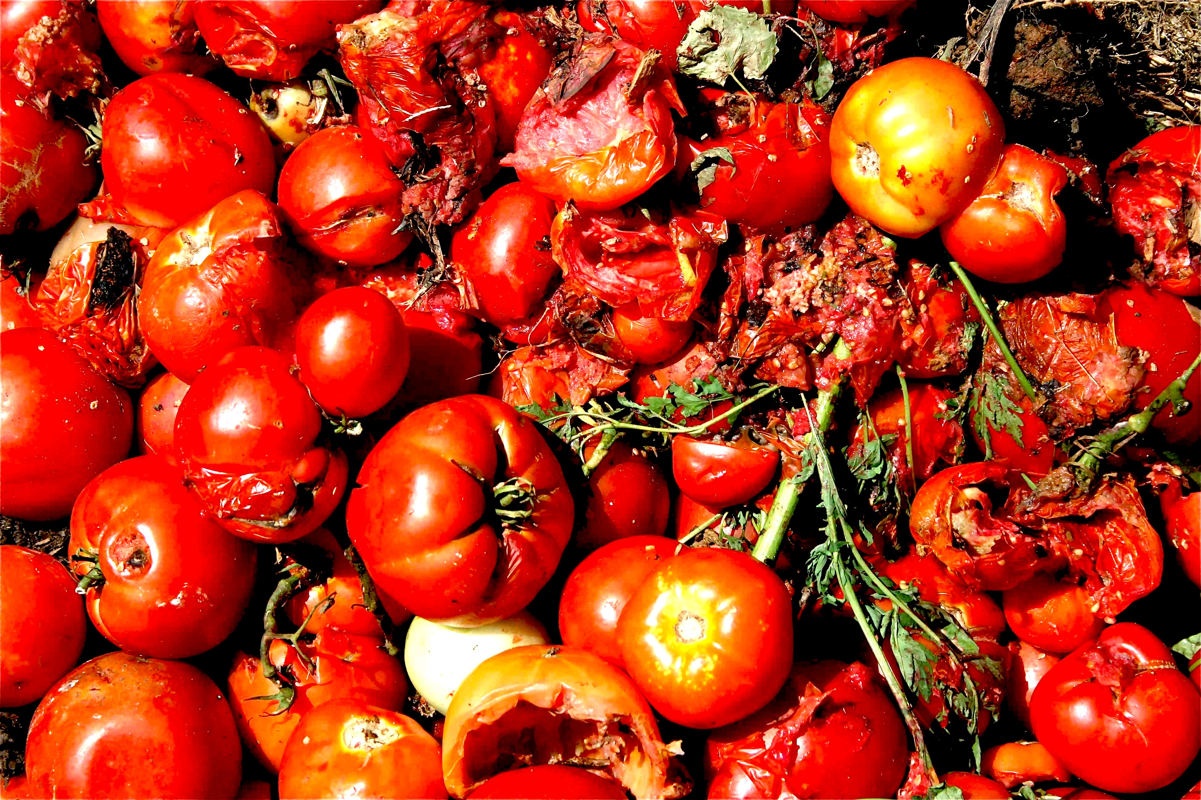 If you think the brightness of this image makes your eyes ache, at least you're being spared the assault on your olfactory system. Rotting tomatoes have a distinctive aroma. These are culled from our harvest at the Lewis Ginter Community Kitchen Garden and placed in the compost heap. Various defects, sometimes minor - including but not limited to small bird peck holes; sometimes bigger bites from squirrels & grounghogs. Those critters never finish the whole tomato. They just have a few bites and move on to the next perfect fruit.