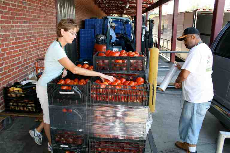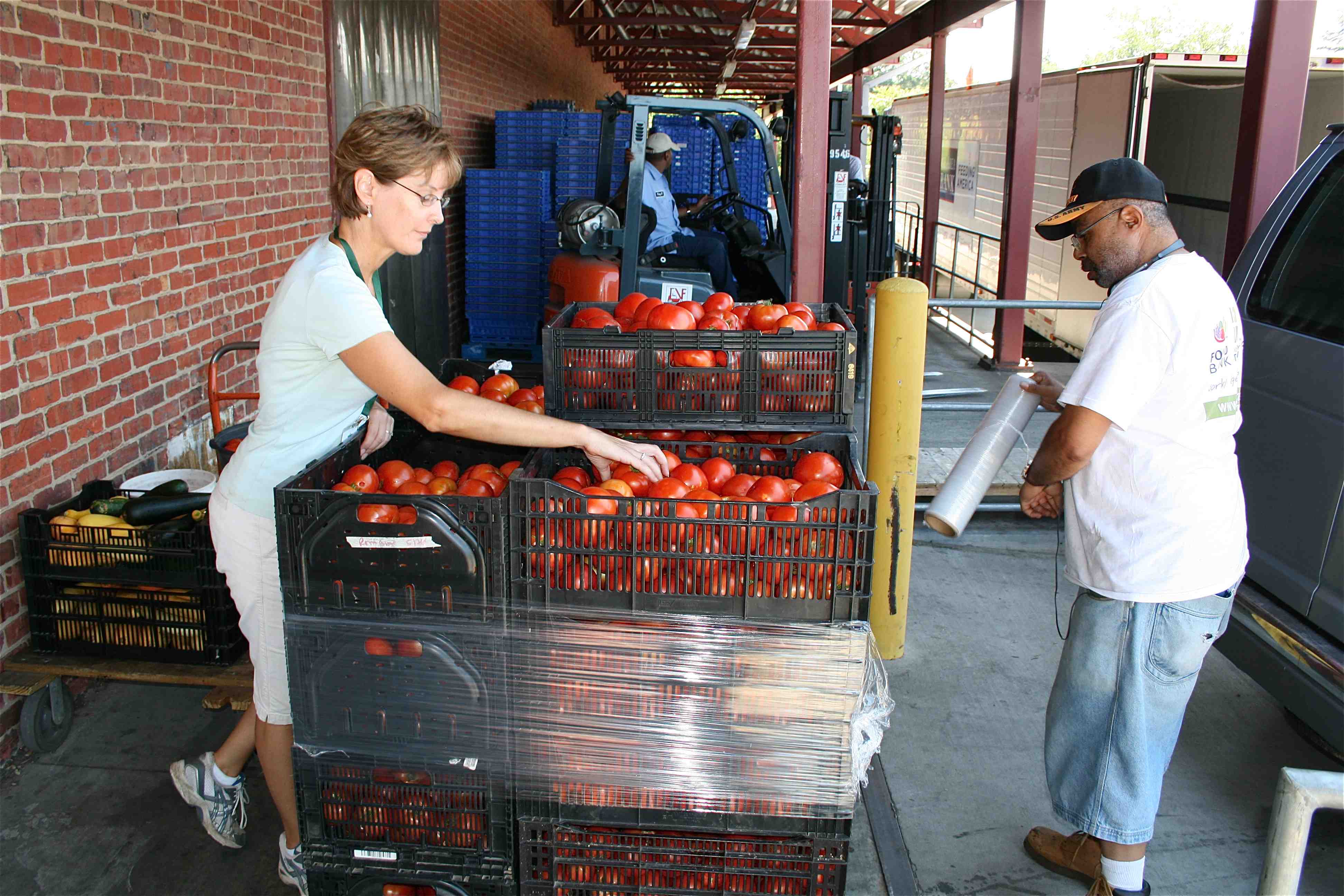 When we rolled up to the FoodBank loading dock we were greeted by FeedMore’s Paul Adams. Paul played football and baseball for Virginia Tech in the mid-70s. Paul entered the collegiate ranks as a .338 hitter with home run power, then focused on football. A four-year letterman running back in football, in 1976 Paul shared VT individual honors for Most Points Scored in a Game (12, vs. Tulsa), and Paul ranks among the Top Twenty ALL-TIME running backs in VT history. Paul still retains his athleticism. He easily lifted 3 crates of tomatoes at a time to help us unload the van. After I lifted my lower jaw from the concrete loading dock I helped Lisa Tedder & Paul unload the produce, power lifting my crates – one at a time.