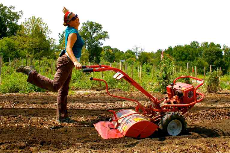 We had a pretty good amount of tilling to do in the vegetable garden to get ready to plant the Fall crop, so we pulled out the Troy-Bilt workhorse. Dusty from storage and dirty from its last use, a female co-worker astutely insisted on wiping off the dirt to allow me to easily see the instructions printed on the tiller. That was a big help, since that particular tiller was new to me. These photos illustrate the contrast I described between the male & female approach: manhandling a machine vs. using a light touch.