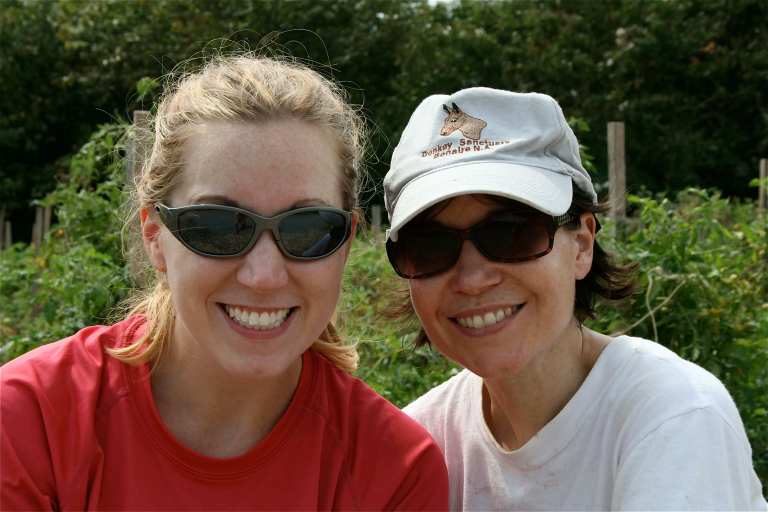 This is Leigh Dorris and Jeannie Arnold, Capital One associates and repeat volunteers in the Lewis Ginter Community Kitchen Garden (CKG). They’re still smiling, after three hours of hard garden work – and get this: Leigh completed a distance running workout and Jeannie walked dogs at the SPCA that morning before they came to the CKG. Their energy level is uplifting, to put it mildly. And the smiles… come on now, let’s everybody do it together.