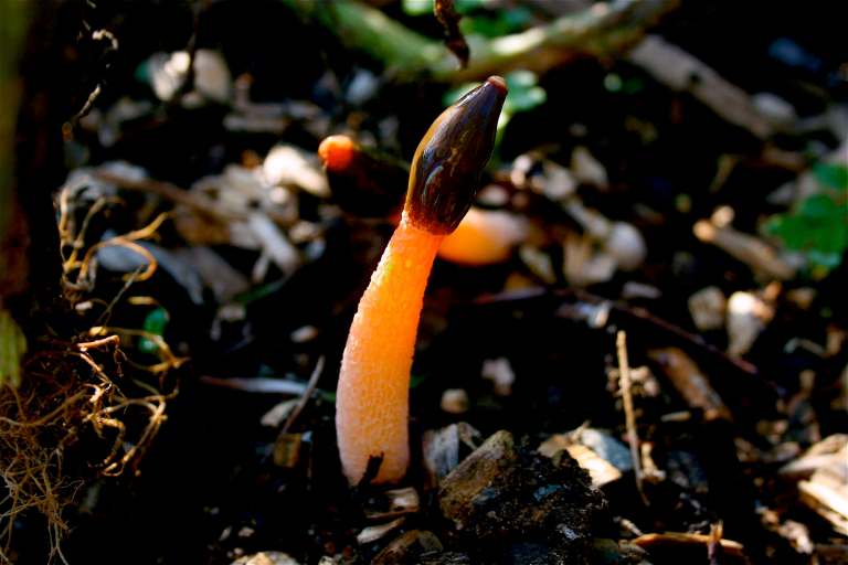 It’s not even officially the start of Autumn yet, so this color theme could go on for awhile. Leigh, one of the vegetable garden regular volunteers, happened upon the funky fungi pictured below and suggested it fits with the “Red” theme. I don’t know what type of fungi it is, but it had a truly strange appearance in the early morning light – almost as if it was battery-powered.