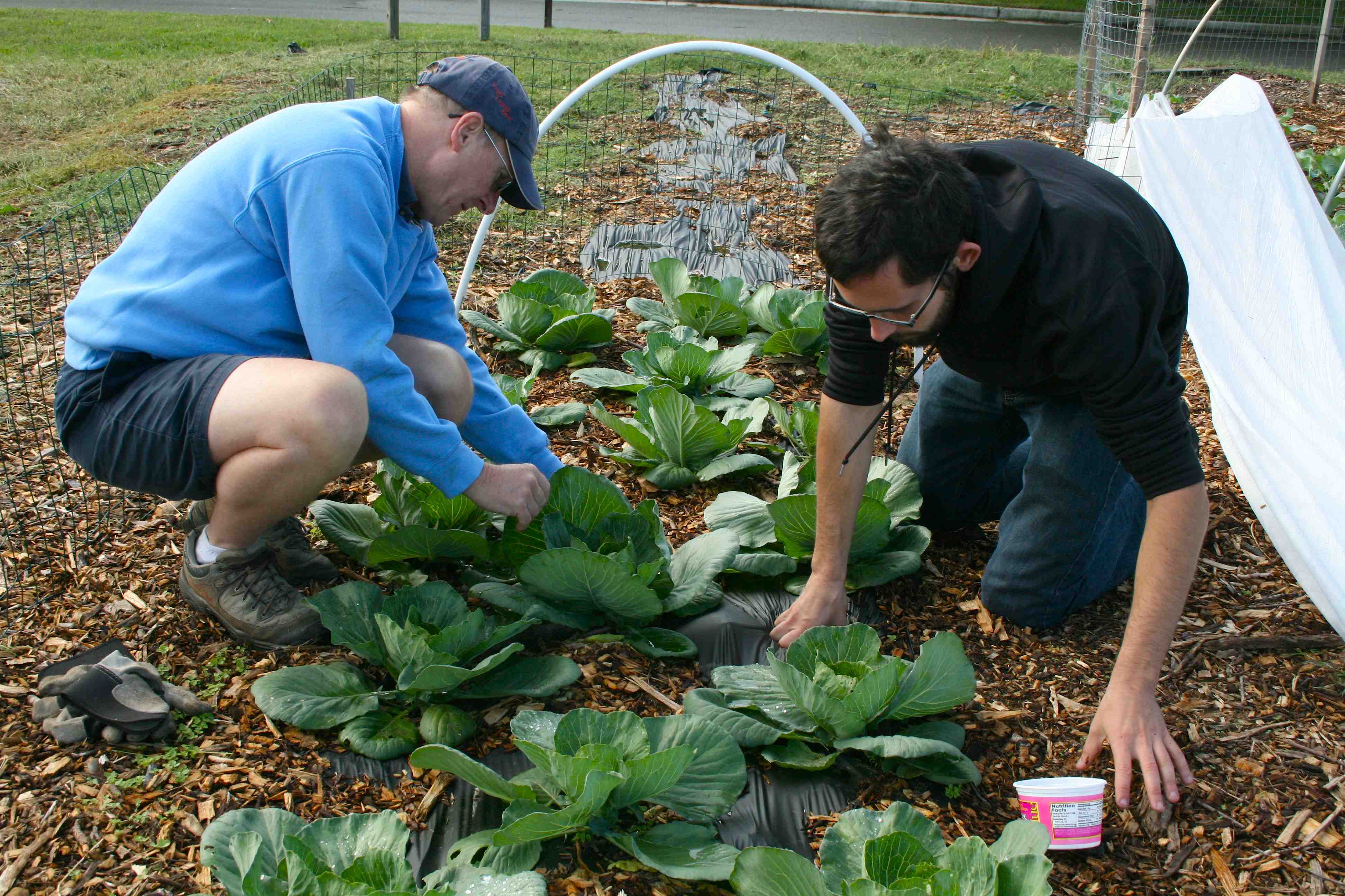 The large number of volunteers was perfect for our primary task of the day – manual intervention to control cabbage worms. Our experiment with row covers produced a completely surprising, antithetical observation: The covered plants had many more worms than the uncovered plants. Theories? (Uncovered plants allowed predators to get to the worms; the cool nights drove the worms under the row covers to the warmer environment…?)