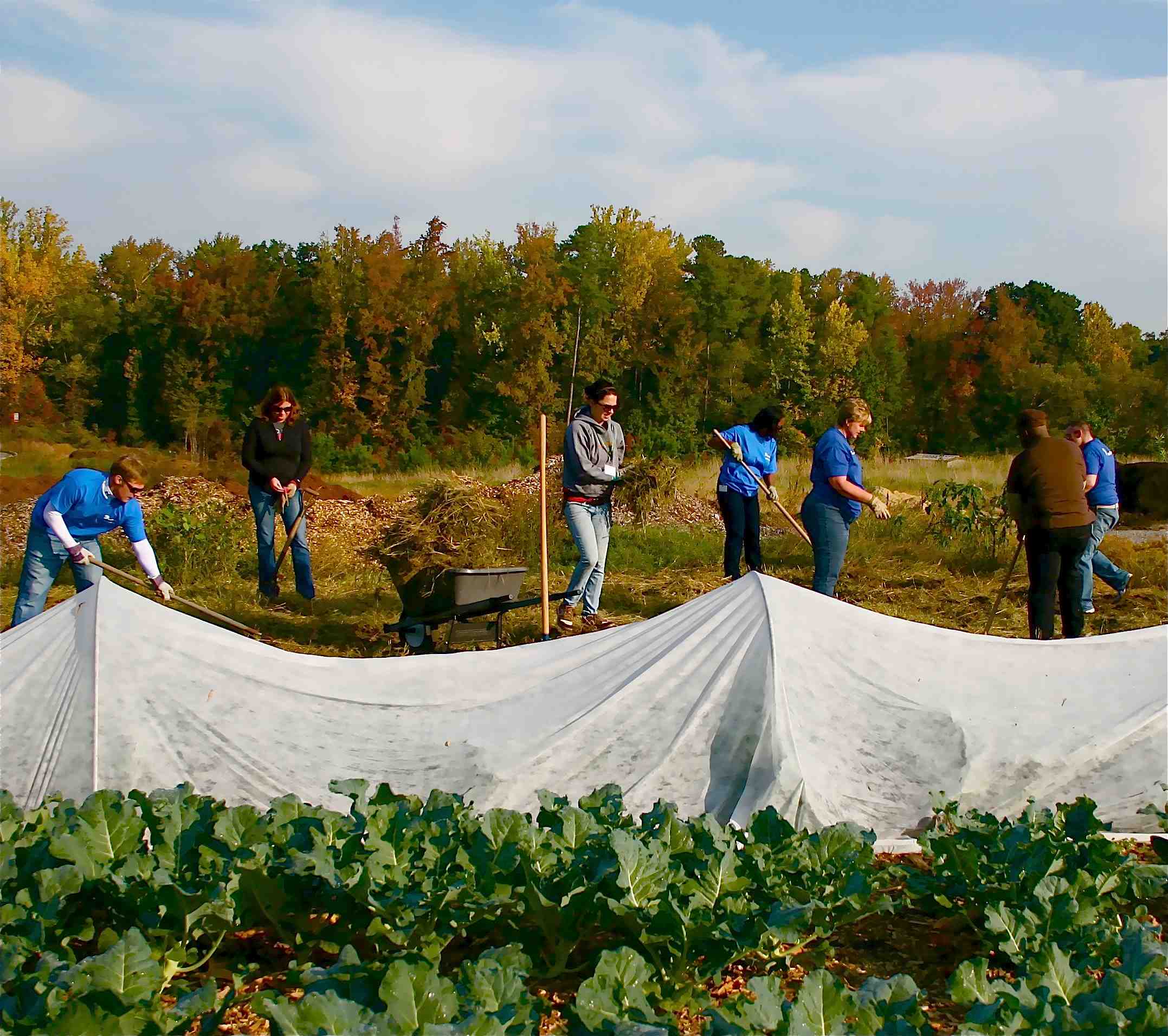 Last Saturday morning a group of seven Dominion Power associates worked in the Lewis Ginter Community Kitchen Garden. What started out as a shiver-inducing brisk morning quickly turned into t-shirt weather as the team cleared a large area to prep for the winter cover crop. The team also continued our “manual intervention” pest management system by hand-inspecting the fall crop for cabbage worms. Happily for everyone, no worms were found.