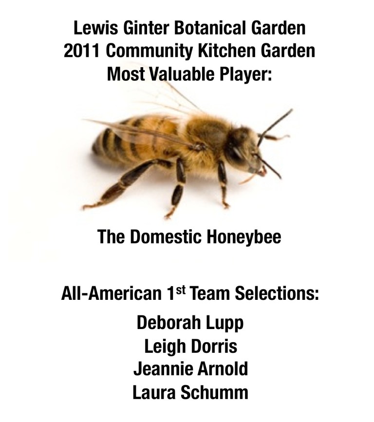 Kudos to the many volunteers who contributed sweat equity to the Community Kitchen Garden over the 2011 season. Your efforts produced a significant benefit for the needy in the Greater Richmond area. In addition, the success of the Community Kitchen Garden was a major factor in the National Medal recognition bestowed on Lewis Ginter Botanical Garden by the Institute of Museums and Library Services.