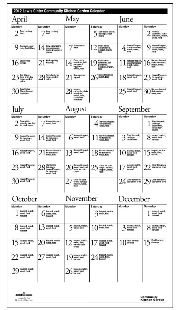 It’s almost time to get out in the 2012 Lewis Ginter Community Kitchen Garden (CKG). Some nice new things are in the plan: expanding the space by 5,000 square feet (or maybe more); greater plant diversity; wheelchair accessible raised beds. I’ll publish the garden layout plans soon. For now, here’s the work session calendar. Bear in mind that all plans are subject to force majeure (acts of nature). We hope everyone that helped last year can participate again this year – and bring family, friends and co-workers. More info to come soon regarding registration/sign-up.