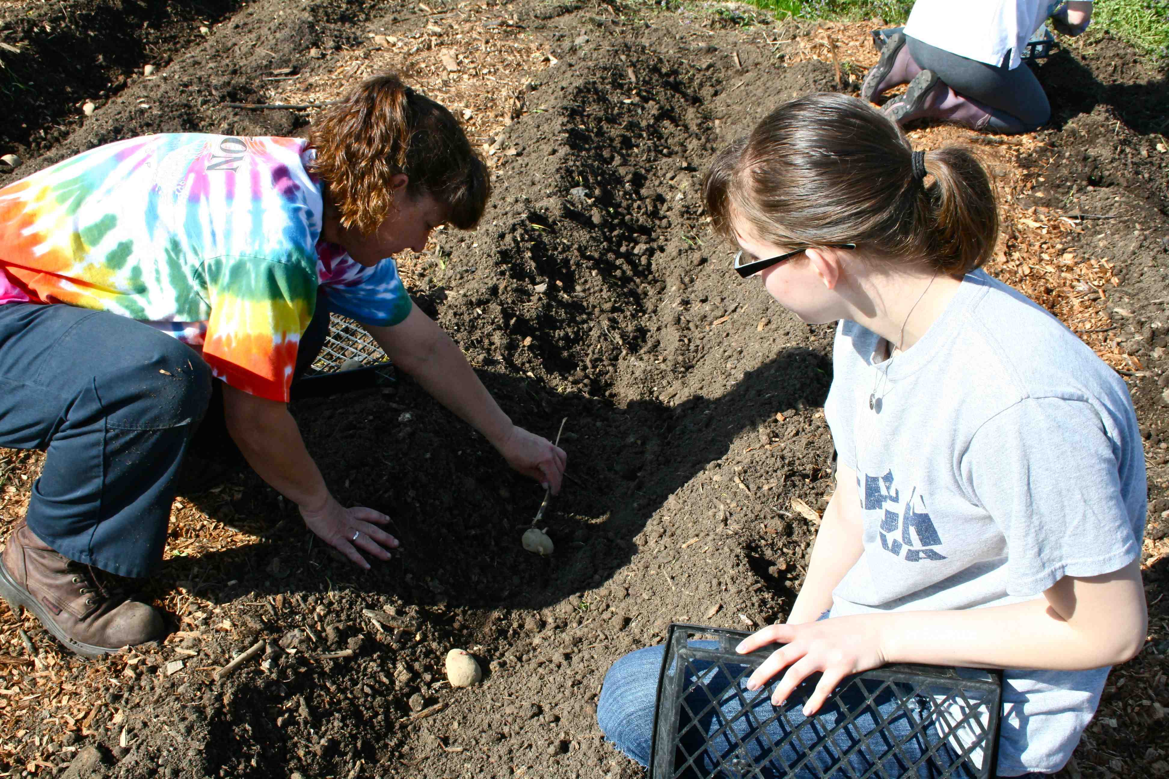 We were very happy today as a lucky group of seven planting Red Pontiac potatoes in the Lewis Ginter Community Kitchen Garden. We planted 335 seed potatoes and/or cuttings. While there’s no guarantee all will sprout and produce, we had some very strong eyes (potato eyes) on our cuttings, and the volunteer crew took great care with the planting. With a little nurturing we hope this effort will produce a nice delivery of new potatoes by the end of May for FeedMore’s Community Kitchen.