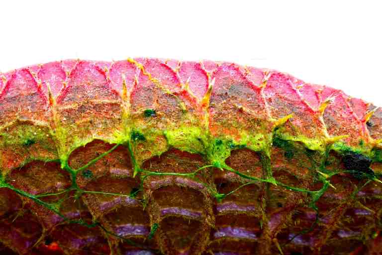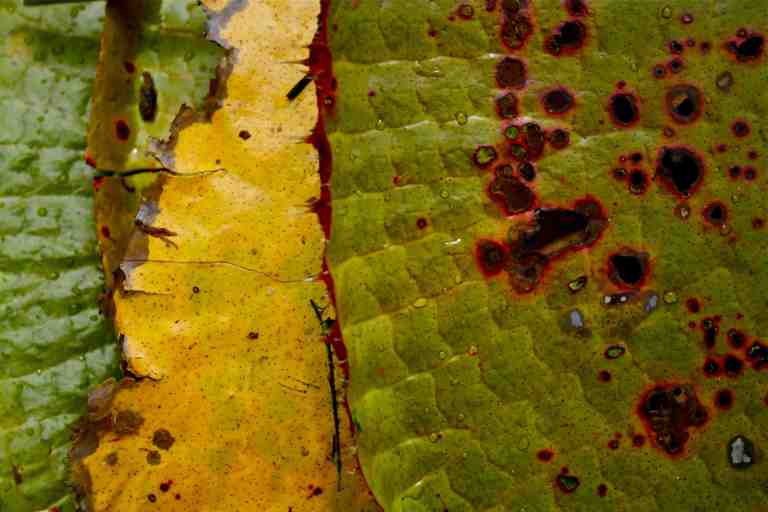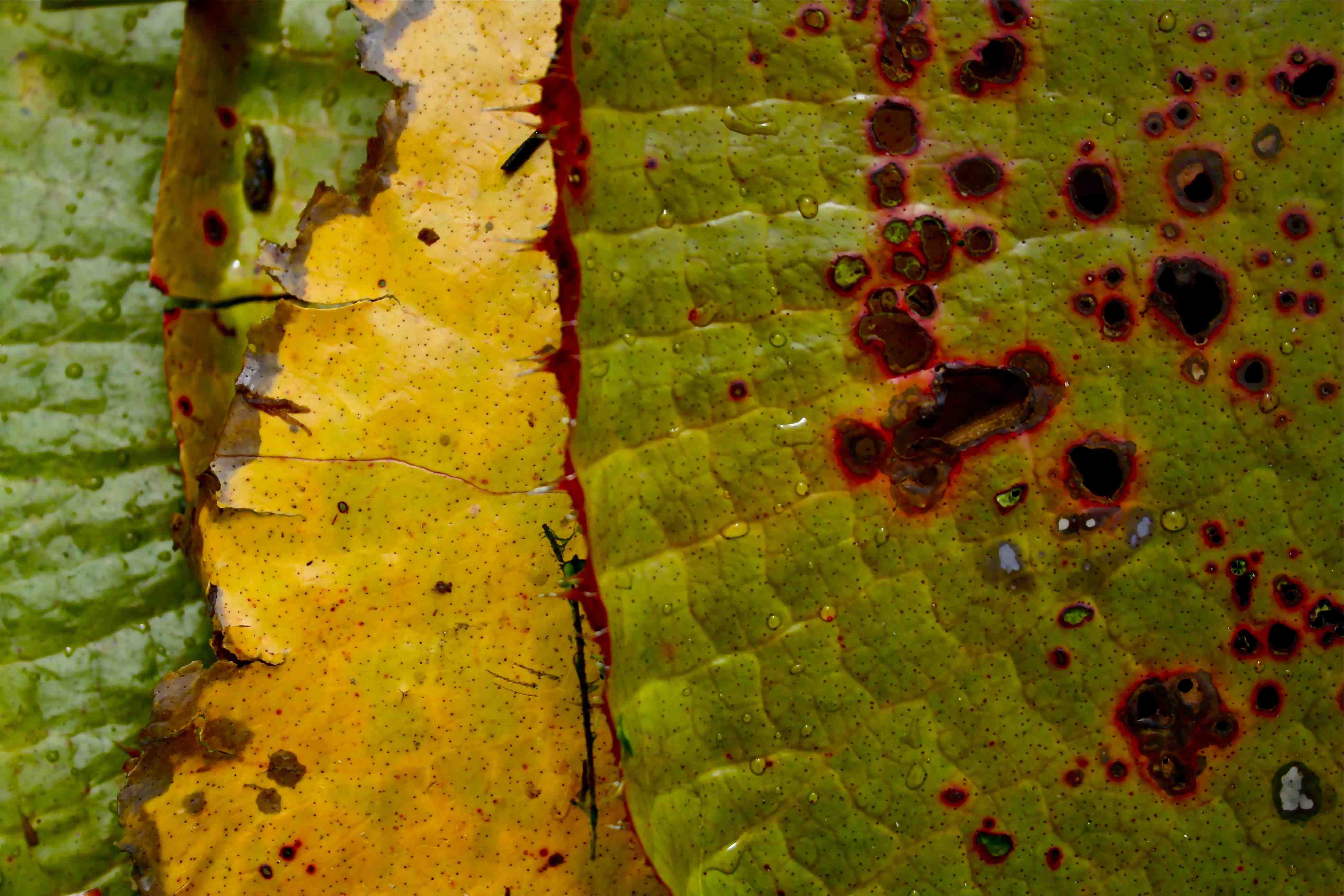 Before we start rolling into a palette of autumnal tones, here’s a tropical colorburst. A peek at the 2012 edition of the secret garden… a shady spot illuminated by tropical color. The underside of a discarded leaf from a Victoria Amazonica water lily… only slightly tweaked to enhance the natural tropical colors. Victoria Amazonica leaf surfaces, resembling the surface of some planet in outer space, peppered by molten meteors and asteroids.