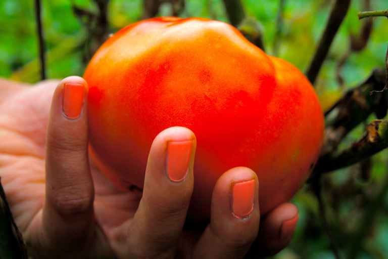 There’s something incongruous about a chilly 50 degree, gray, wet day and the warm color of ripening tomatoes on the vines. The stark contrast reinforces the realities of our seasonal transition. We’re about to say farewell to our last tomatoes in the Lewis Ginter Community Kitchen Garden. After all, it is nearly mid-October. At one point this summer we had over 600 vines in the garden, including several varieties of heirlooms and hybrids. Now we’re down to only 10 vines (hybrid beefsteak variety, planted relatively late). We remove the majority of our vines a wee bit early in the fall for two reasons: 1) we need some of the space for cole crops, and 2) we want to ensure good germination of our winter cover crops before the soil starts to freeze.