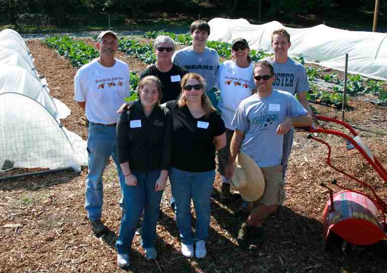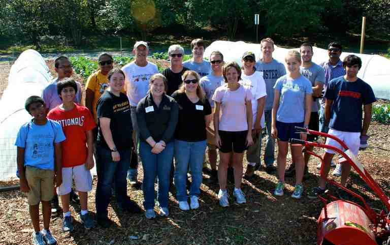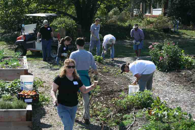 The Wooster Fighting Scots – alumni & parents from the College of Wooster – came out to the Lewis Ginter Community Kitchen Garden on October 6. Maybe they were attracted by the fact that most of the Community Kitchen Garden occupies the highest elevation on the Lewis Ginter Botanical Garden campus (the “highlands”) but most likely it was strictly for the important community service. The Wooster Fighting Scots joined in with volunteers from HandsOn Greater Richmond to form a dynamic team, accomplishing a ton of gardening labor in one short beautiful morning. Fading tomato vines were pulled out. Cabbage, cauliflower and onions were planted. The cole crops were fertilized with fish emulsion and seaweed extract.