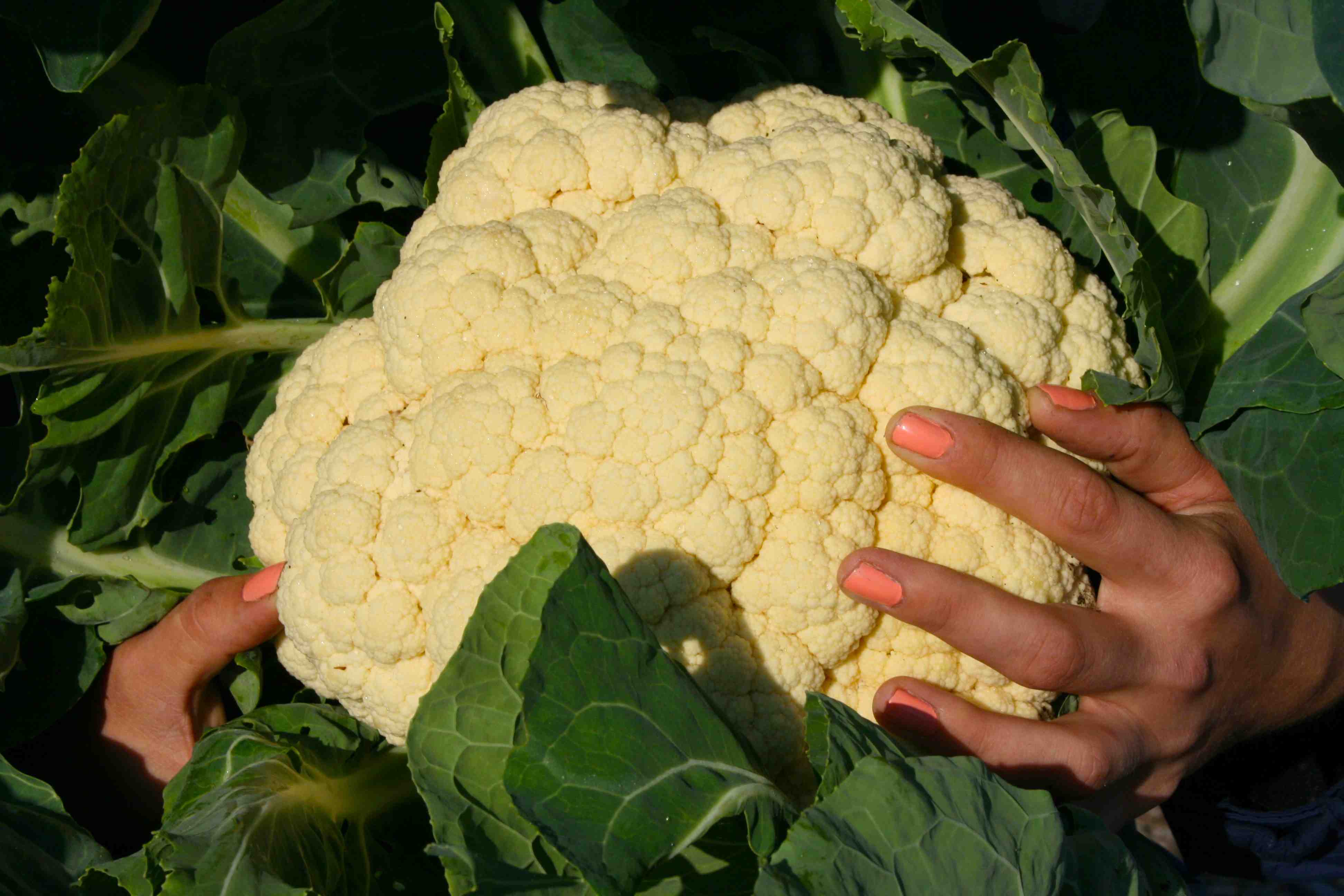 The cauliflower in the Lewis Ginter Community Kitchen Garden is maturing slowly but surely. The cooler than normal temperatures have slowed the process, but we’ve already harvested 110 lbs. of Snow Crown curds and 70 lbs. of cauliflower leaves for delivery to FeedMore.