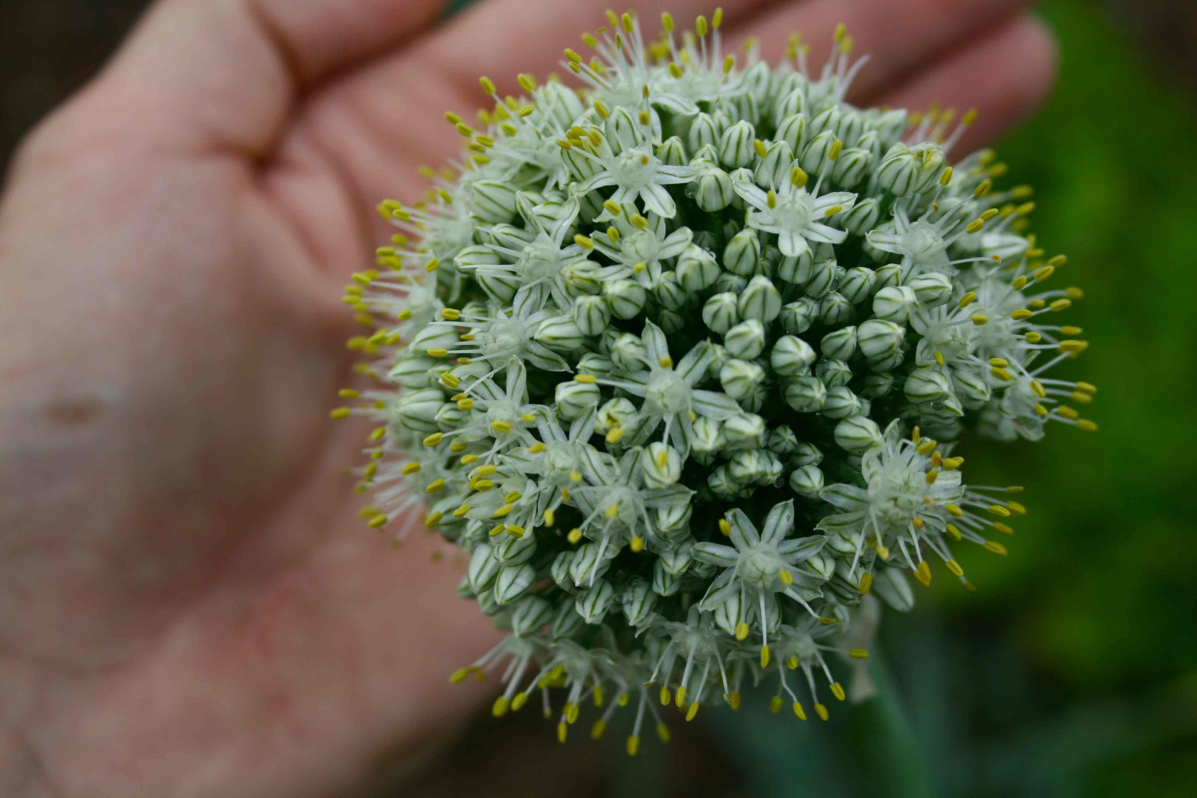 Our yellow onion bulbs didn’t get very large, but the flower heads were dramatically beautiful during June. The tall flower stalks were amazingly sturdy, and cuttings have lasted for days in a bucket. The stalks and flowers would be a dramatic addition to floral arrangements… except for the pungent and permeating aroma of onion. The entire onion plant is edible – including the flowers – so doesn’t the idea of sprinkling the small flowers on a food item sound like a cool culinary “presentation” element?