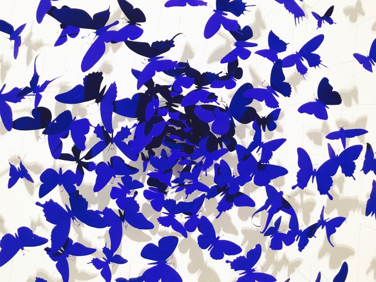 Title: Gyre (2017). Work by Paul Villinski (American, Born 1960), currently on display in the Taubman Museum of Art, Roanoke, VA, as part of a mid-career retrospective (“Farther”). Aluminum cans collected on the streets of New York, hand-cut or laser-cut into shapes of endangered or extinct butterfly species.Mod seating in the Taubman Museum of Art, Roanoke, Virginia.