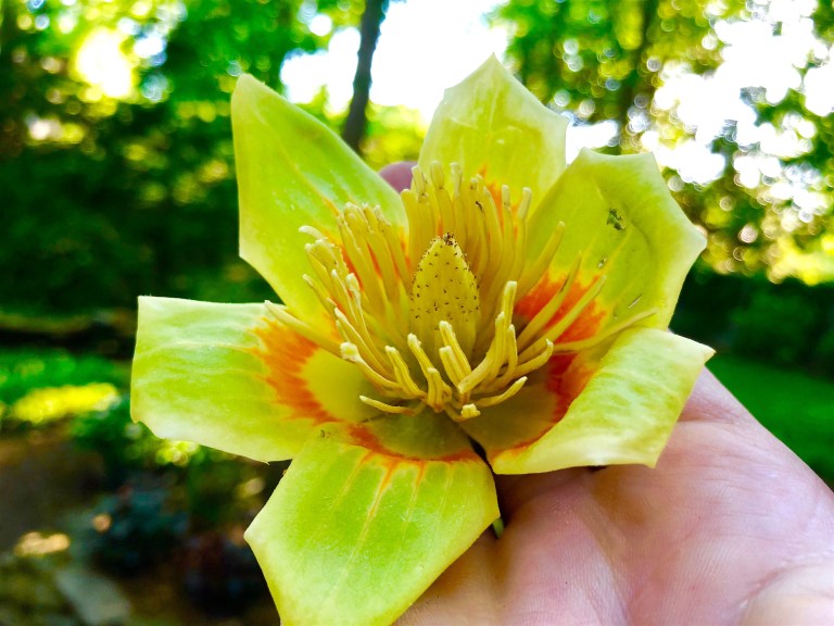 A bloom from Liriodendron tulipifera (Tulip Poplar), ubiquitous in Central Virginia. Actually a member of the magnolia family (Magnoliaceae) – not a true Poplar – but not to be confused with Tulip Magnolia. The bloom is pretty because of the brightness of it’s color… the contrast of cream, chartreuse & orange – exceptional among native American hardwoods. The colorful base helps guide bees and hummingbirds to nectar. Ugly because of the creepy filaments. Strange because the blooms are 80 feet up in the tree, only to be seen by giants, or when the blooms crash to earth – and by then usually past prime.