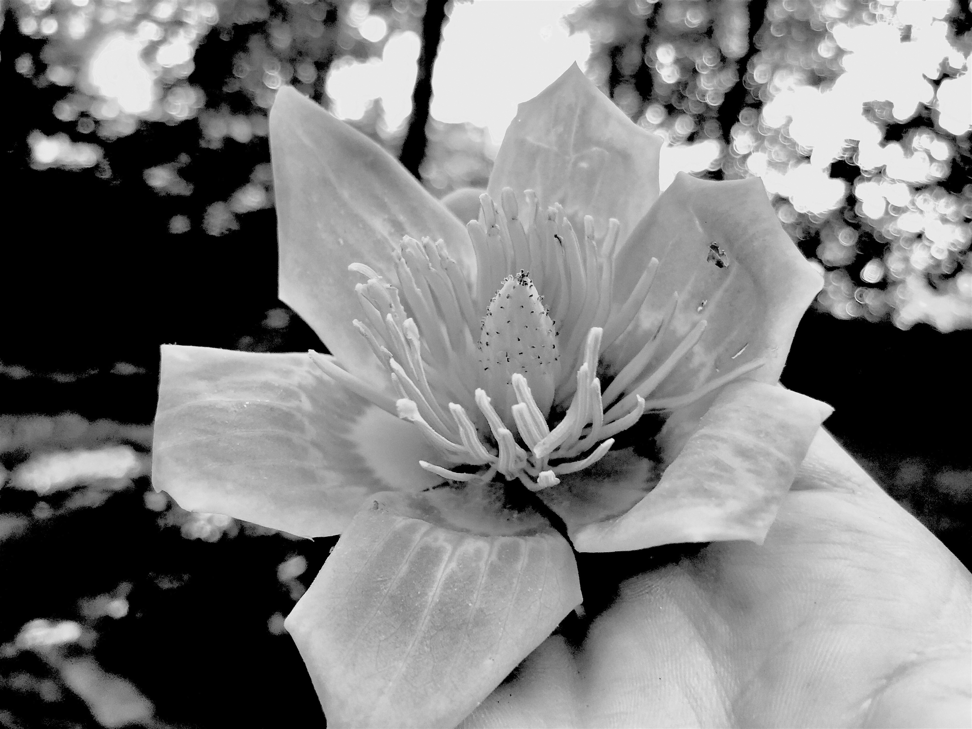 A bloom from Liriodendron tulipifera (Tulip Poplar), ubiquitous in Central Virginia. Actually a member of the magnolia family (Magnoliaceae) – not a true Poplar – but not to be confused with Tulip Magnolia. The bloom is pretty because of the brightness of it’s color… the contrast of cream, chartreuse & orange – exceptional among native American hardwoods. The colorful base helps guide bees and hummingbirds to nectar. Ugly because of the creepy filaments. Strange because the blooms are 80 feet up in the tree, only to be seen by giants, or when the blooms crash to earth – and by then usually past prime.