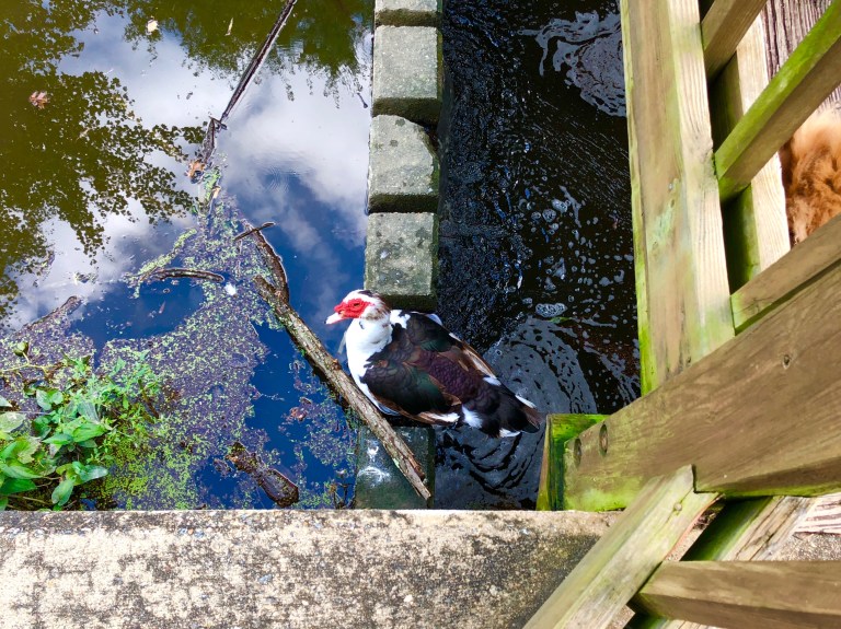 A Muscovy duck (Cairina moschata) has appeared on the lake at Deep Run Park. Muscovy ducks are native to Mexico, Central & South America, but generally domesticated in the U.S., except for small feral populations in the deep southern U.S. It’s likely it didn’t fly in during migration. It’s huge – for it’s species – so maybe it got too big for it’s owner. It’s odd looking among the mallards and Canadian geese, but strangely beautiful in its oddness.