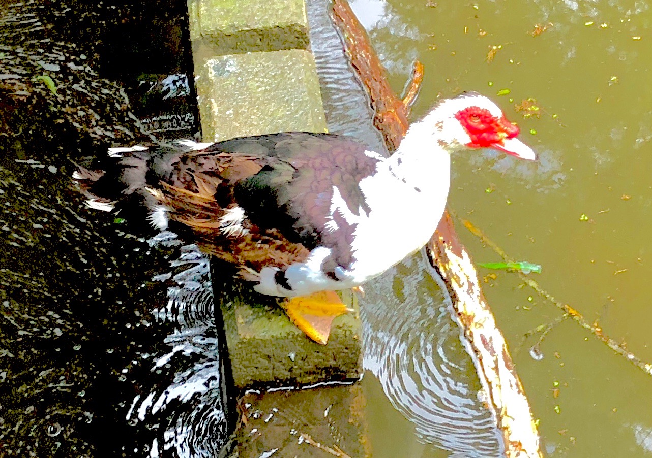 A Muscovy duck (Cairina moschata) has appeared on the lake at Deep Run Park. Muscovy ducks are native to Mexico, Central & South America, but generally domesticated in the U.S., except for small feral populations in the deep southern U.S. It’s likely it didn’t fly in during migration. It’s huge – for it’s species – so maybe it got too big for it’s owner. It’s odd looking among the mallards and Canadian geese, but strangely beautiful in its oddness.