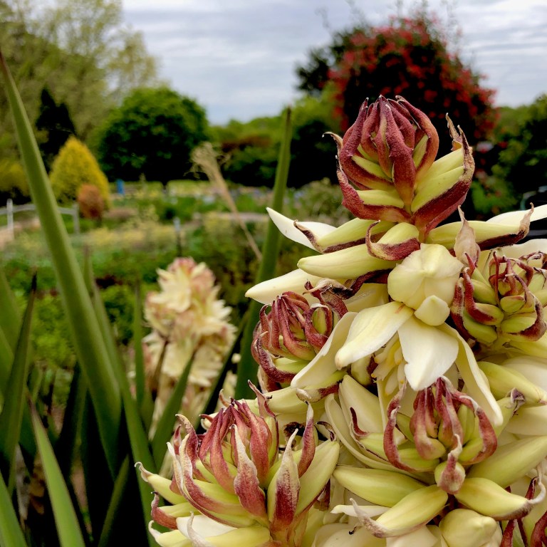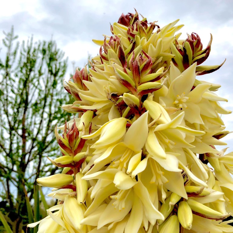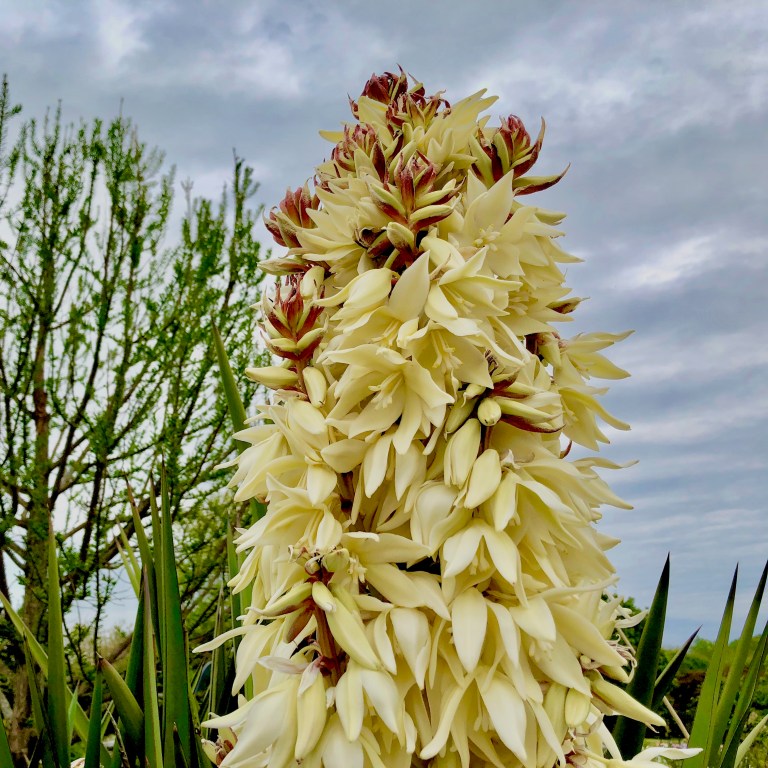 Talk about your effervescent inflorescence. This is a giant yucca blooming in the secret garden. The garden is so secret, the specimen has a hidden identity. It’s possibly Yucca coahuilensis (native to the Coahuila region of Mexico and Southwest Texas – and is clearly frost tolerant). The inflorescence is currently about 6′ tall, and will likely reach 8′.