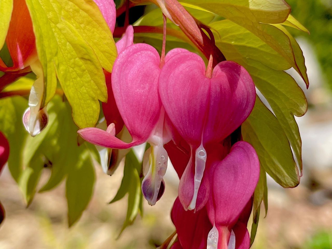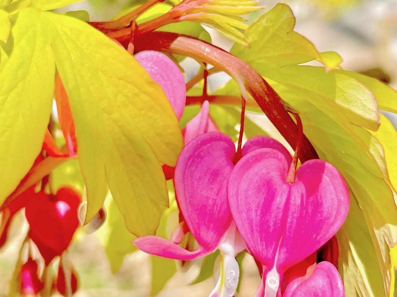 Laprocapnos spectabilis (formerly Dicentra spectabilis) is known as Bleeding Heart, native to northern Asia. This specimen is likely the cultivar “Gold Heart”, due to its foliage color – although it has pink hearts/blooms. Some cultivars have green foliage and white blooms, like “Alba”. Beware, Laprocapnos spectablis is toxic to dogs.
