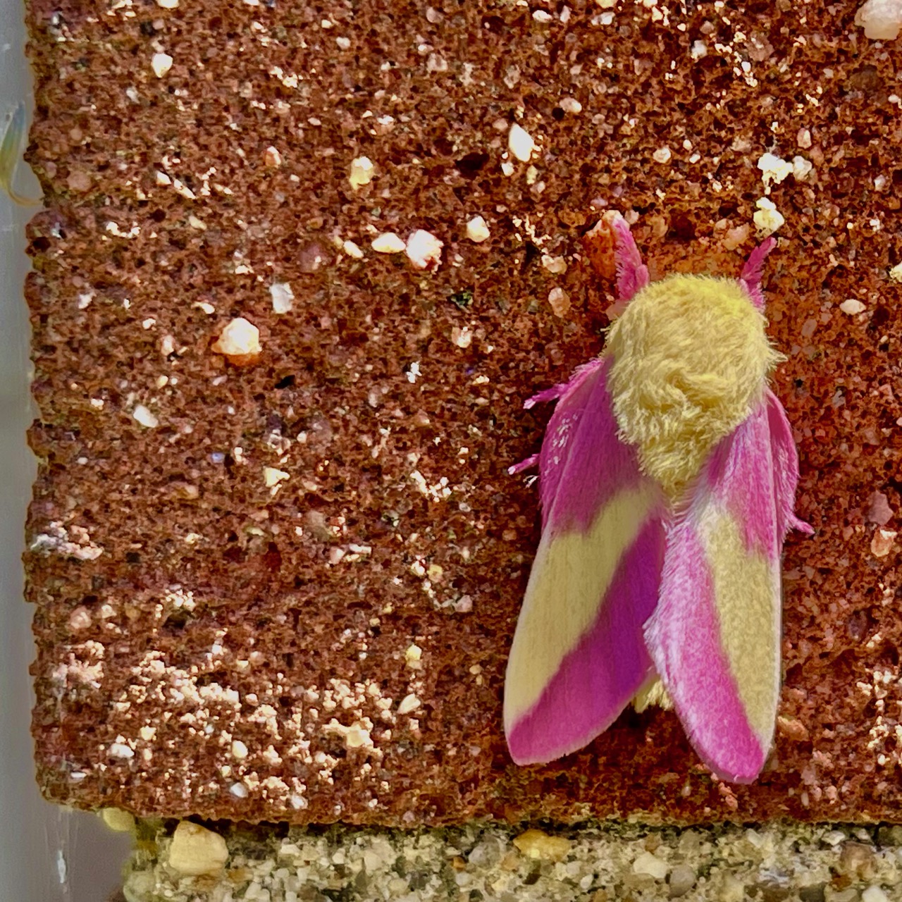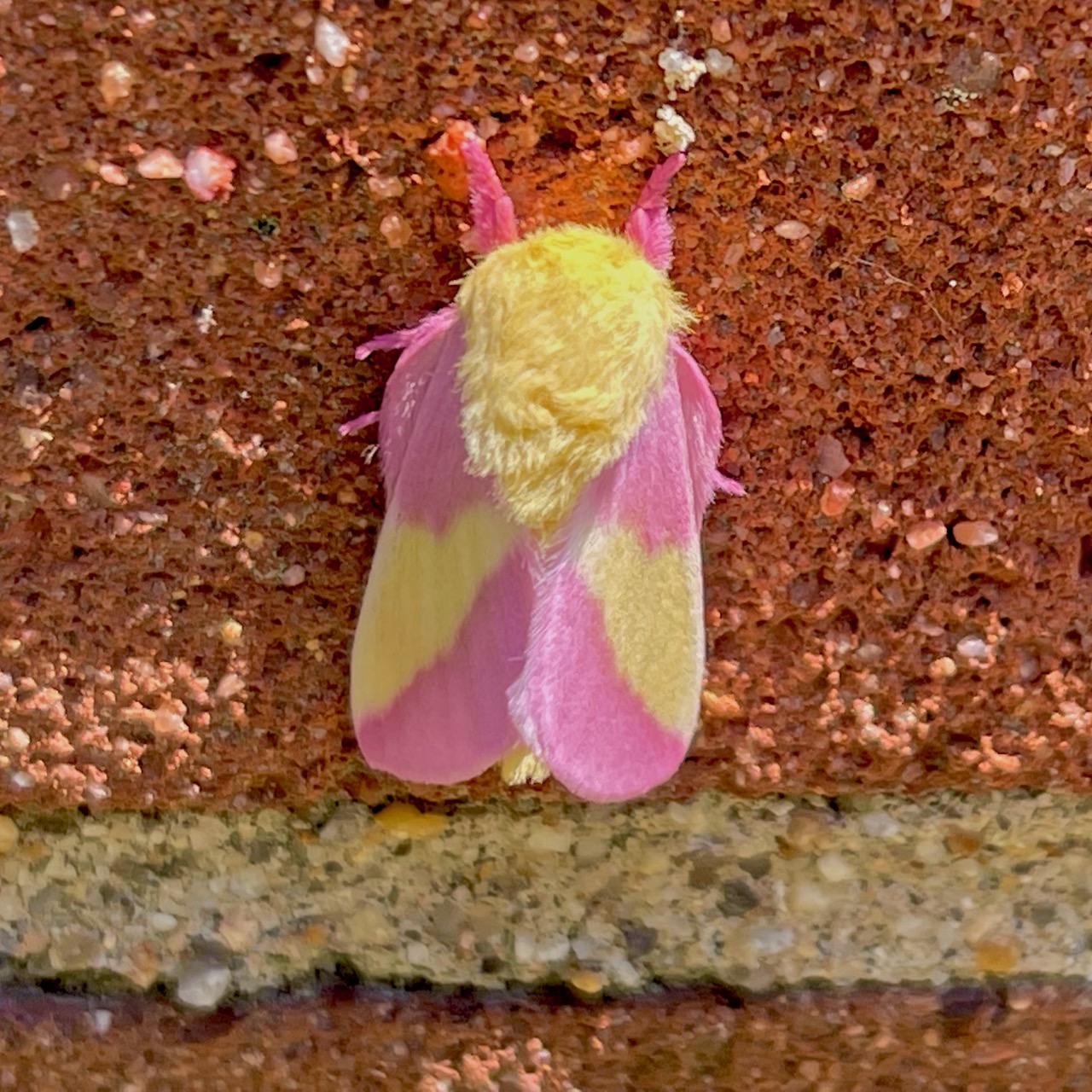 This Gorgeous George is actually a rosy maple moth – Dryocampa rubicunda. The original Gorgeous George was an American professional wrestler in the 1940s-50s known for a flamboyant style, including blonde wavy hair and a penchant for elegant robes. See the comparison?