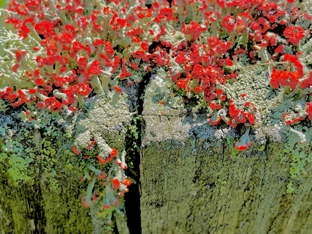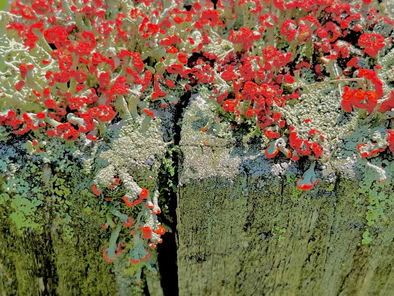 Lichen is a symbiotic combination of an alga and a fungus – the alga on the bottom, fungus on the top – similar to how the part of mushroom fungi we eat is the top, erupting above a vast underground network of mycelia.