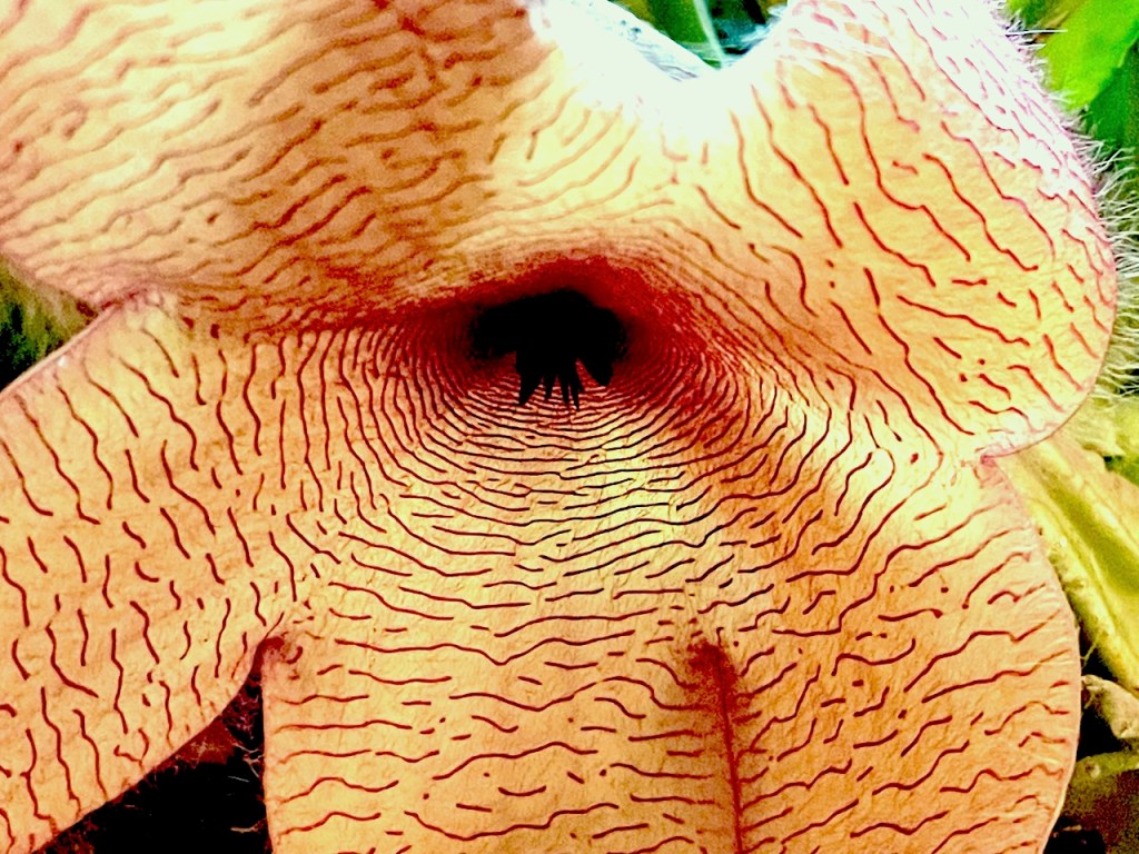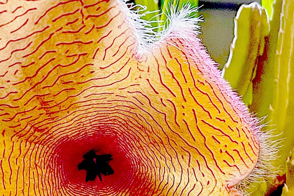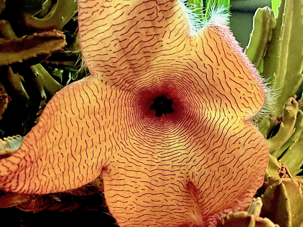 Stapelia gigantea, otherwise known as Carrion Flower, Zulu Giant, Toad Plant or Starfish Cactus. An African native, the plant looks like a cactus, but it’s a non-spiny succulent in the milkweed family. The large (10″-16″), fascinating flower emits a malodorus aroma resembling the smell of rotting meat. This specimen is in a private collection, but you can enjoy one at bloom time indoors at your local botanical garden.