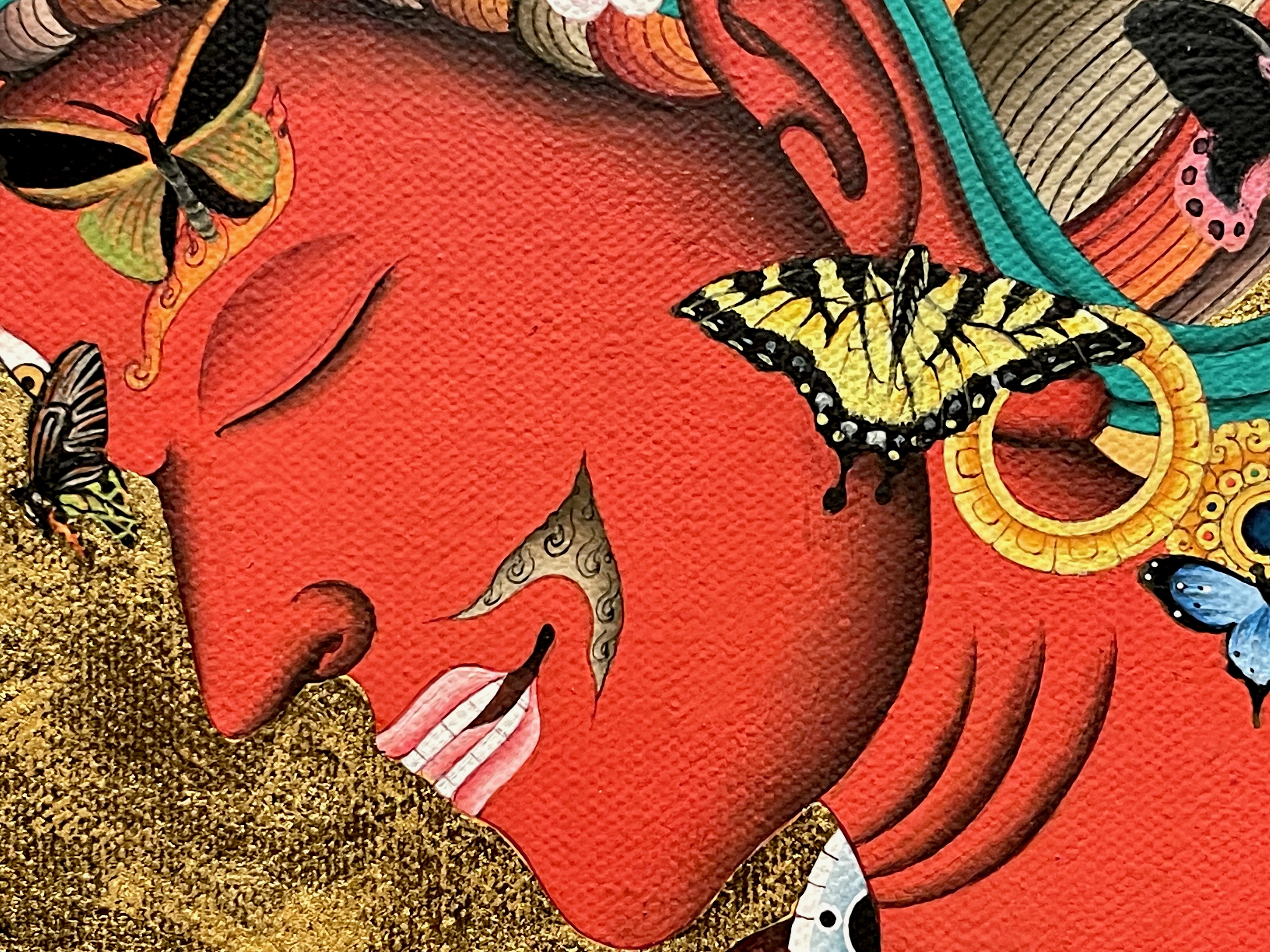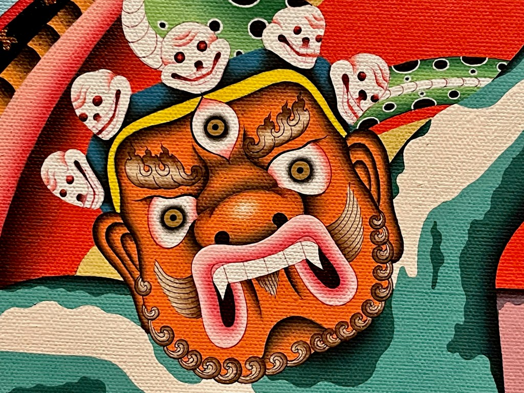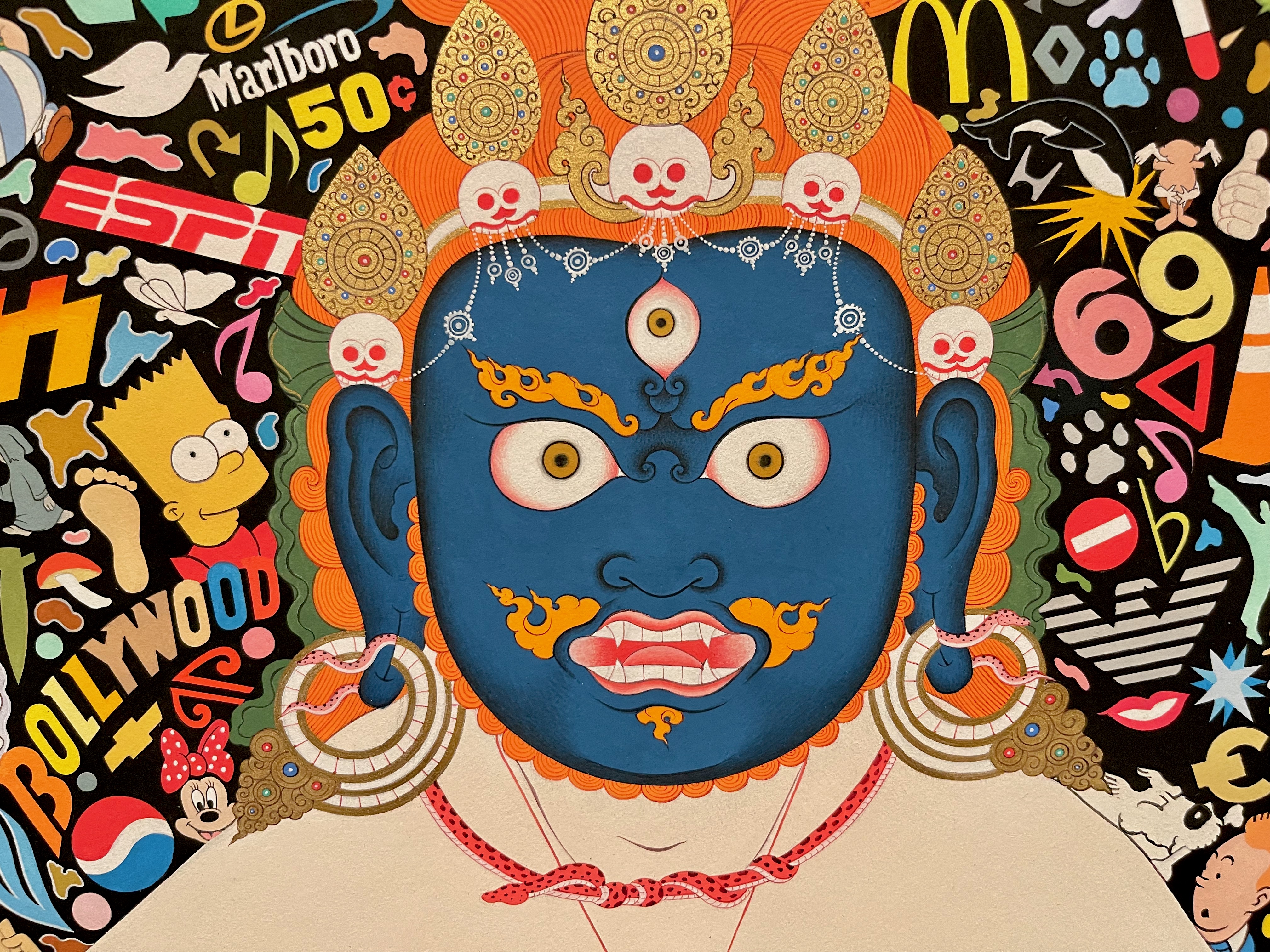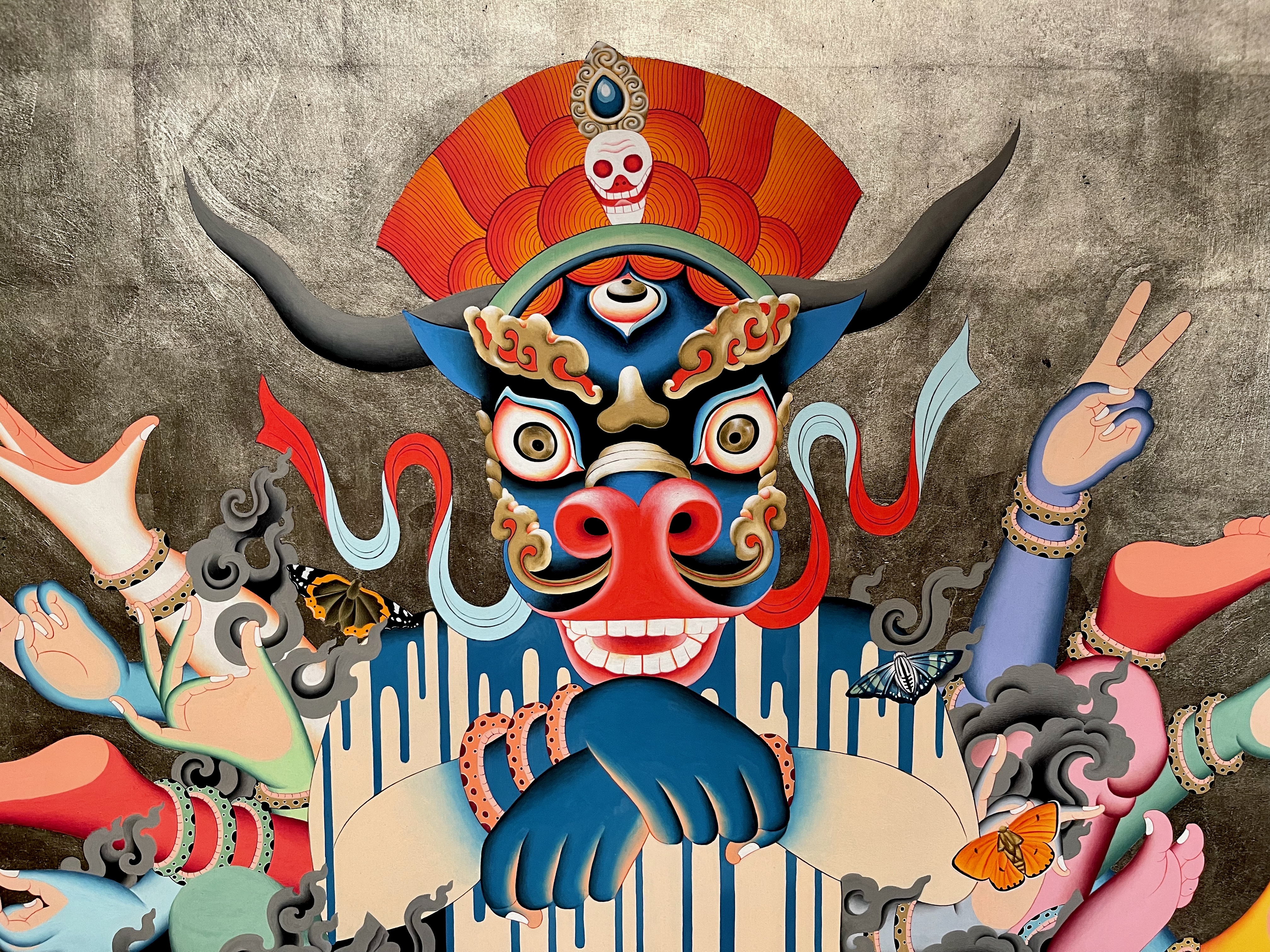 Here are a few details from works by Nepalese-born Tibetan American artist Tserin Sherpa (Tserin Sherpa: Spirits) currently on display at the Virginia Museum of Fine Arts. Sherpa incorporates elements of Western pop culture with traditional Tibetan spiritual art. The complex works are loaded with minute details, and these photographic enlargements allow us to see… well… see “more”. Paradoxically, it’s sometimes difficult for visitors to get close enough to the works to enjoy the small details. For example, during one visit at a different exhibition an overzealous young guard chastised a visitor who attempted to point out a painting’s detail – because the visitors’ hand (a la “Wild Pointy Finger” by Hayes Carll) crossed the viewing line.
