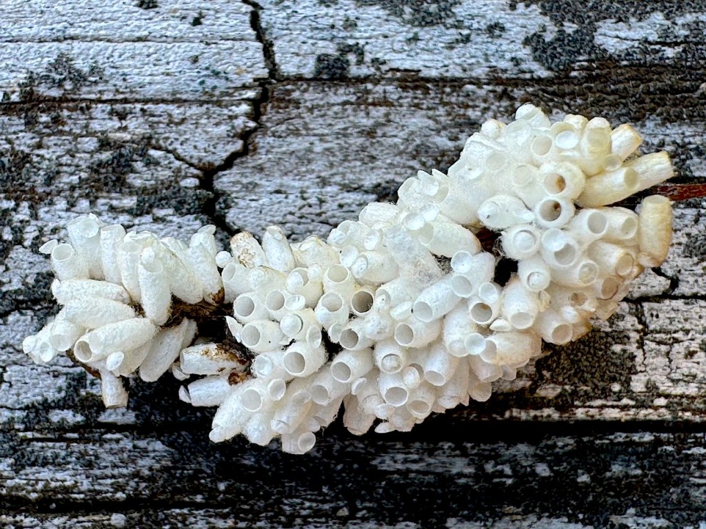 Looks like barnacles, but it’s the egg sac for tiny, parasitic (but beneficial) braconid wasps. These are most likely Cotesia congregates. The adult wasp lays eggs directly onto a mature Tomato Hornworm, the eggs hatch and the baby parasitic wasps eat the hornworm. It’s the Circle, the Circle of Life.